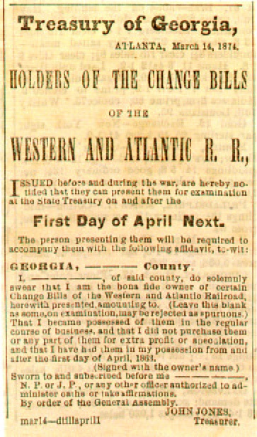 Even before the line was completed, the W&A RR was bringing in significant revenue into the Georgia treasury. In 1847 it contributed $125,000 to state revenue. By 1860 the W&A RR was contributing 50% of the state's revenue. When the Civil War began in 1861, Virginia, Georgia and Tennessee were 1st, 2nd and 3rd in miles of railroad track (1771, 1404, and 1197 miles). The Union forces chose to follow the railroads from Nashville to Chattanooga to Atlanta to allow easy supply to the advancing troops, as well as denying the Confederacy the use of the railroads for supplies and troop movement. A booklet issued by the Southern Baptist Convention in 1896 gives an overview of War Sceenes and View Pointers of the battles between Chattanooga and Atlanta. ScopeCopper and silver coins that were in circulation prior to the war were being hoarded because their metal content was more valuable than their face value. As a result, the Georgia legislature authorized up to $200,000 in Western & Atlantic Railroad "change bills" in denominations of 5¢, 10¢, 25¢, 50¢ and $1 on December 17, 1861. This listing includes all of the existing W&A RR change bill types issued. The change bills were dated starting January 20, 1862, series A, through March 1, 1863, series M.