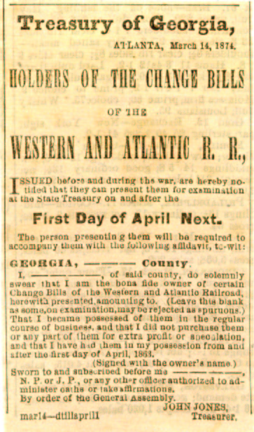 OverviewThe Georgia legislature recognized the importance of fostering railroad construction to open up the western portions of the state and granted charters to build three major lines in 1833: Augusta to Athens, Savannah to Macon and Macon to Forsyth. The legislature followed up by establishing the Western & Atlantic Railroad (W&A RR) in 1836 to connect the Chattahoochee River to the Tennessee River. They also provided for the extension of the railroads from Athens and Forsyth to the Western and Atlantic. In 1837 surveyors for the three railroads selected a locale 7 miles southeast of the Chattahoochee River as a southern terminus for the railroads. A small settlement, aptly named Terminus, arose at this location. While work was progressing on the Western and Atlantic, Terminus grew, changing its name to Marthasville in 1843 and to Atlanta (in honor of the railroad) in 1845. Lt. Col. Stephen H. Long surveyed and laid out the 108-mile route to the Tennessee border in 1837. Three potential routes from the Tennessee border were provided. He estimated the cost at 2.1 million dollars and provided a detailed plan for the first 25 miles. The Georgia legislature authorized the Georgia Railroad based on the plan. The Georgia legislature funded the railroad over the veto of Governor Gilmer using the federal funds from the sale of public lands and borrowing the remainder. Bids for the first 25 miles were issued in April 1838 and hiring started on March 2. The lack of funds as a result of the national Panic of 1837 - 1842 delayed and finally halted construction. Construction began again as the economy improved. The first 22 miles from Marietta to Atlanta were completed in September 1845. The line was completed to Dalton in July 1847. Because of the difficulty in constructing the tunnel north of Dalton, at Tunnel Hill, the track on the other side of the proposed tunnel was started and completed to Chattanooga before the tunnel was completed. The tunnel opened on May 9, 1850 completing the W&A RR. Even before the line was completed, the W&A RR was bringing in significant revenue into the Georgia treasury. In 1847 it contributed $125,000 to state revenue. By 1860 the W&A RR was contributing 50% of the state's revenue. When the Civil War began in 1861, Virginia, Georgia and Tennessee were 1st, 2nd and 3rd in miles of railroad track (1771, 1404, and 1197 miles). The Union forces chose to follow the railroads from Nashville to Chattanooga to Atlanta to allow easy supply to the advancing troops, as well as denying the Confederacy the use of the railroads for supplies and troop movement. ScopeCopper and silver coins that were in circulation prior to the war were being hoarded because their metal content was more valuable than their face value. As a result, the Georgia legislature authorized up to $200,000 in Western & Atlantic Railroad "change bills" in denominations of 5¢, 10¢, 25¢, 50¢ and $1 on December 17, 1861. This listing includes all of the existing W&A RR change bill types issued. The change bills were dated starting January 20, 1862, series A, through March 1, 1863, series M. Post script